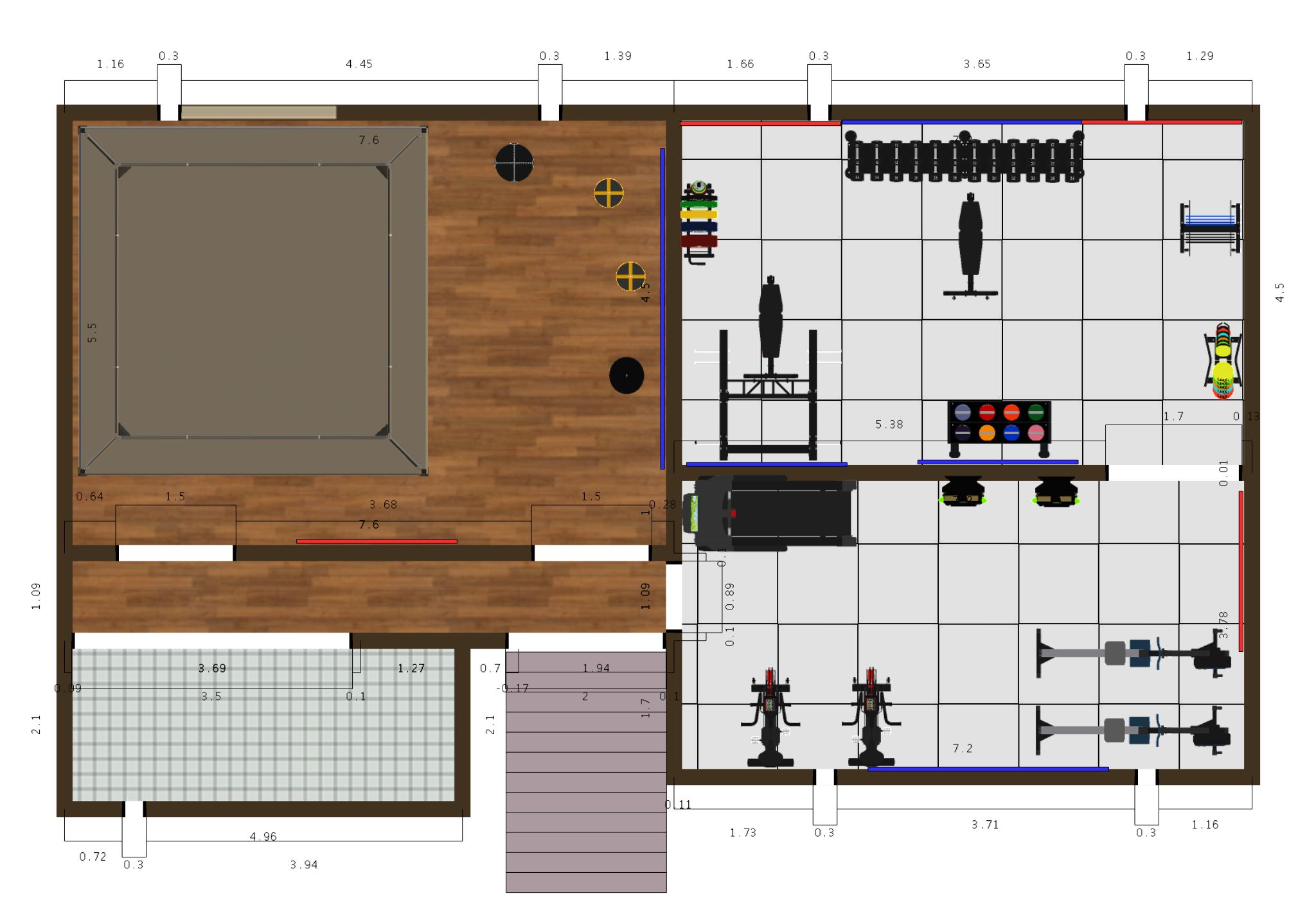 Nakon odabira stila uređenja fitnessa, određuju se kote vanjskih i unutarnjih zidova i stolarije, pomno se izabire oprema, kombinira boja kako bi se postiglo adekvatno riješenje.